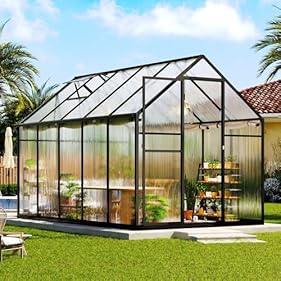 178×300×192CM Gewächshaus aus Polycarbonat und Aluminium für Garten/Terrasse, Tomatengewächshaus mit 2 Fenstern und Schwingtür, Winterfest (Schwarz)