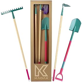 KADAX Gartenwerkzeug-Set, 4er Set, Metall Spaten, Rechen und Hacke, Gartenwerkzeug für Damen, Inclusive Handschuhe, Gartenset, Gartengeräte