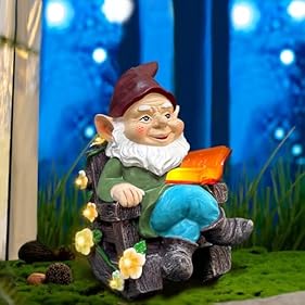 Zwerge Feengarten-Zubehör für den Außenbereich – was für eine lustige Zwergenstatue! Dieser attraktive Gartenzwerg für den Außenbereich verfügt über einen entzückenden Rasenzwerg mit einem freundlichen Lächeln, der gemütlich auf einem exquisiten Schaukelstuhl sitzt und ein leuchtendes Zauberbuch liest. Verziert mit bunten Sukkulenten-LED-Lichtern, funkeln diese charmanten Gartenfiguren im Freien in der dunklen Umgebung. Der warmgelbe Lichteffekt strahlt ein märchenhaftes Gefühl aus und schafft eine lebendige und entspannende Szene in einer ruhigen Winternacht.