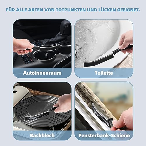 【Reinigungseffekt】: Eine professionelle Spaltreinigungsbürste, die effektiver als eine Zahnbürste ist. Das gebogene Bürstenkopfdesign eignet sich für verschiedene Oberflächenformen und reinigt alle Bereiche gründlich. Das flache Design passt sich den Spalten an und entfernt Schmutz gründlich. Die verlängerten und verbreiterten Nylonborsten sind robust und dicht angeordnet, um auch in Ecken und Winkel zu gelangen und schwer erreichbare Stellen mühelos zu reinigen.