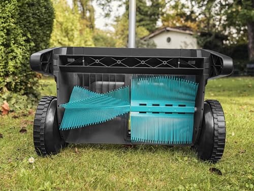 Effiziente Gartenreinigung im Herbst: Die Rasenkehrmaschine mit innovativem Bürstensystem eignet sich für das zeitsparende Sammeln von Laub, Vertikutiergut und Grasschnitt auf großen Rasenflächen
