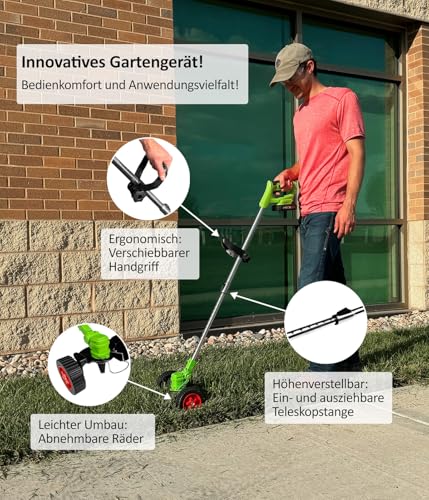 Vielseitig anwendbar: Rasenmähen, Trimmen von Büschen, Schneiden von hohen Ästen, Beseitigen von Unkraut u.v.m.!
