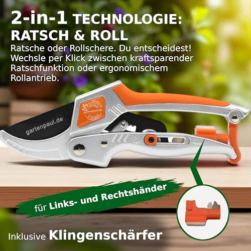 ✅ INNOVATIV: Die Gartenpaul Ratsche 2.0 vereint zwei Antriebstechniken in einem Tool, Ratsche für harte Äste bis 25 mm und Rollantrieb für schnelle Schnitte bis 15 mm. Einfach per Knopfdruck wechseln und mühelos schneiden, ganz ohne Kraftverlust.