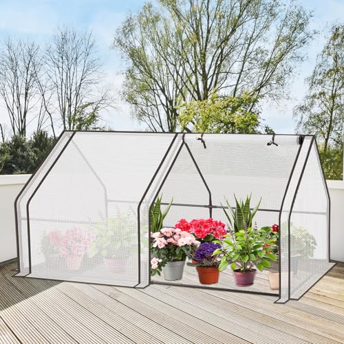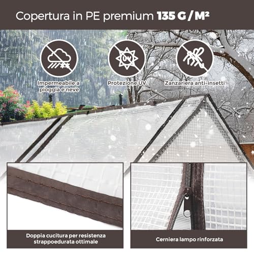 【Gewächshausfolie】Das Gewächshaus besteht aus 𝟏𝟑𝟓 𝐠/𝐦² weißem PE-Netzgewebe mit verstärktem Netz, das Schutz vor Regen, Schnee und Sonne bietet. Zwei breite 𝐑𝐞𝐢ß𝐯𝐞𝐫𝐬𝐜𝐡𝐥𝐮𝐬𝐬𝐭ü𝐫𝐞𝐧 77 cm erleichtern das Einbringen von Pflanzen und sorgen für eine gute Belüftung.