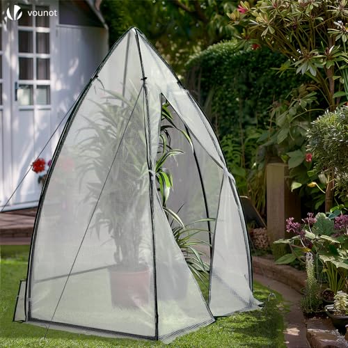 WASSERDICHTE 135g/m2 VERSTÄRKTE ABDECKUNG: Unsere Gewächshausabdeckung ist aus hochdichtem Polyethylen hergestellt, das langlebig, UV-beständig, reißfest und wasserdicht ist. Die Reißverschlusstür erleichtert das Betreten und Verlassen des Gewächshauses, und das Moskitonetz mit Klettverschluss sorgt für Luftzirkulation, reguliert die Innentemperatur und verhindert das Eindringen von Vögeln und anderen Tieren.