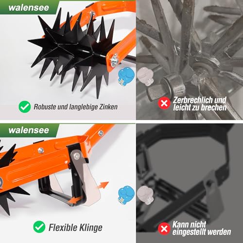 【Rotierender Hand-Gartengrubber】: Mit einem einzigartigen sternförmigen Kopf, Walensee Garten Grubber Werkzeug verwendet einen unverwechselbaren Rollmechanismus, so dass es ein außergewöhnlich praktisches Handgerät für die Gartenarbeit. Der rotierende Fräskopf besteht aus 4 ineinandergreifenden Zahnrädern mit jeweils 9 Zähnen, die den Boden effektiver brechen. Mit Hilfe von vier einzigartig gestalteten Rädern wird der Boden so bearbeitet, dass ein feiner Krümelungsgrad erreicht wird.