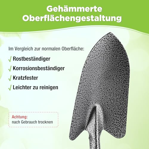 [Gehämmerte Oberflächenbehandlung] Die Werkzeuge verfügen über eine spezielle Hammerschlag-Oberflächenbehandlung. Diese Behandlung erhöht die Kratzfestigkeit und erleichtert die Reinigung der Gartengeräte. Hinweis: Nach Gebrauch sollten die Werkzeuge trocken aufbewahrt werden, um ihre Lebensdauer zu verlängern